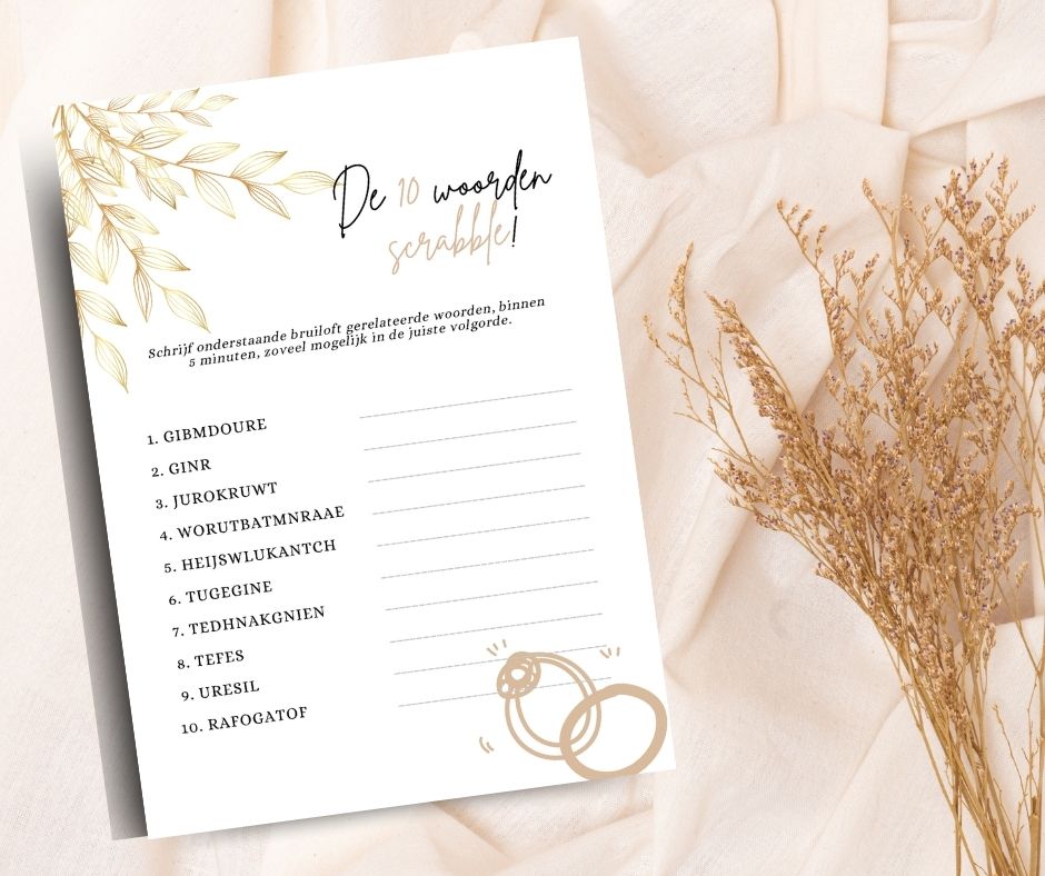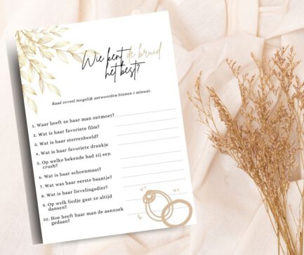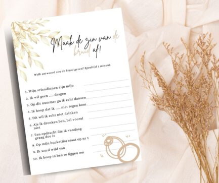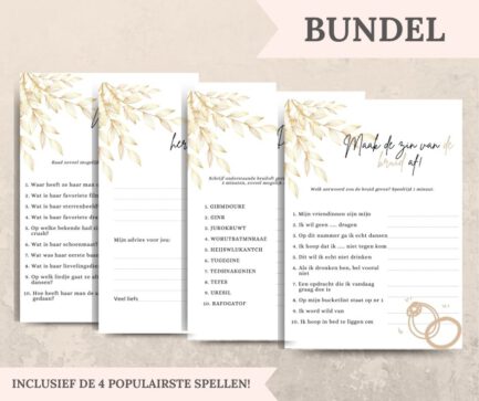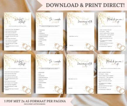 Maak het vrijgezellenfeest nog gezelliger met de Vrijgezellen Wedding Elements bundel! Deze bundel bevat 4 leuke, interactieve en hilarische spellen die het feest meer fun geeft. Print ze uit en breng extra plezier aan het feest!